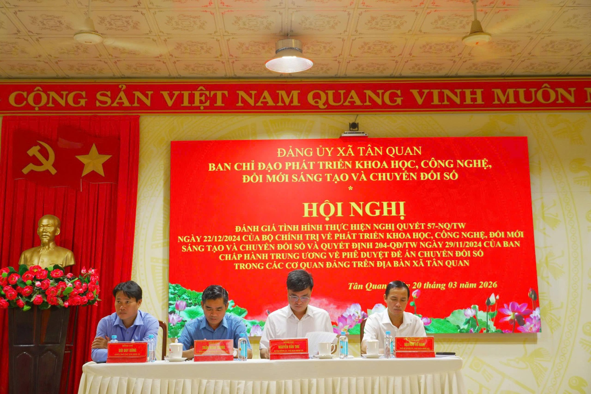 Sáng ngày 20/3/2026, Ban Chỉ đạo xã Tân Quan về phát triển khoa học, công nghệ, đổi mới sáng tạo và chuyển đổi số đã tổ chức hội nghị đánh giá kết quả thực hiện nghị quyết số 57-NQ/TW ngày 22/12/2024 của Bộ Chính trị về đột phá phát triển khoa học, công nghệ, đổi mới sáng tạo và chuyển đổi số quốc gia trên địa bàn xã trong năm 2025; triển khai kế hoạch thực hiện nhiệm vụ năm 2026.
