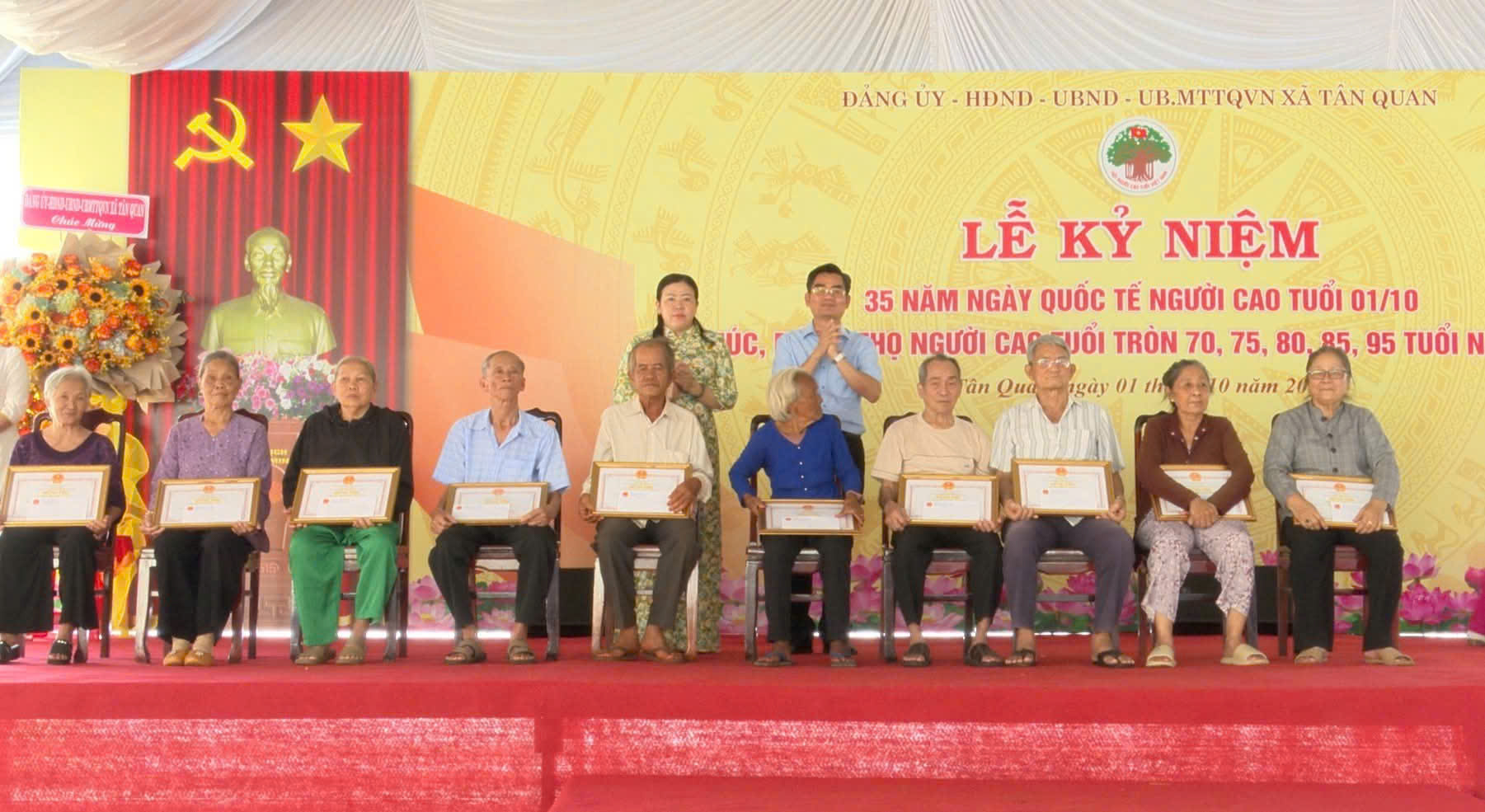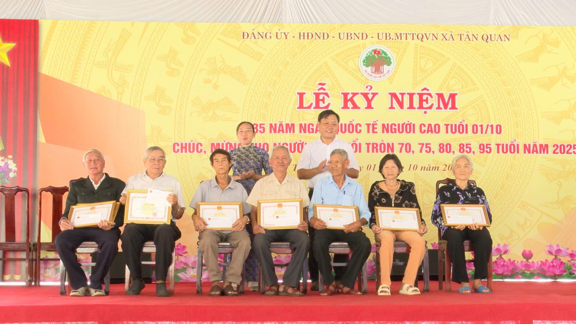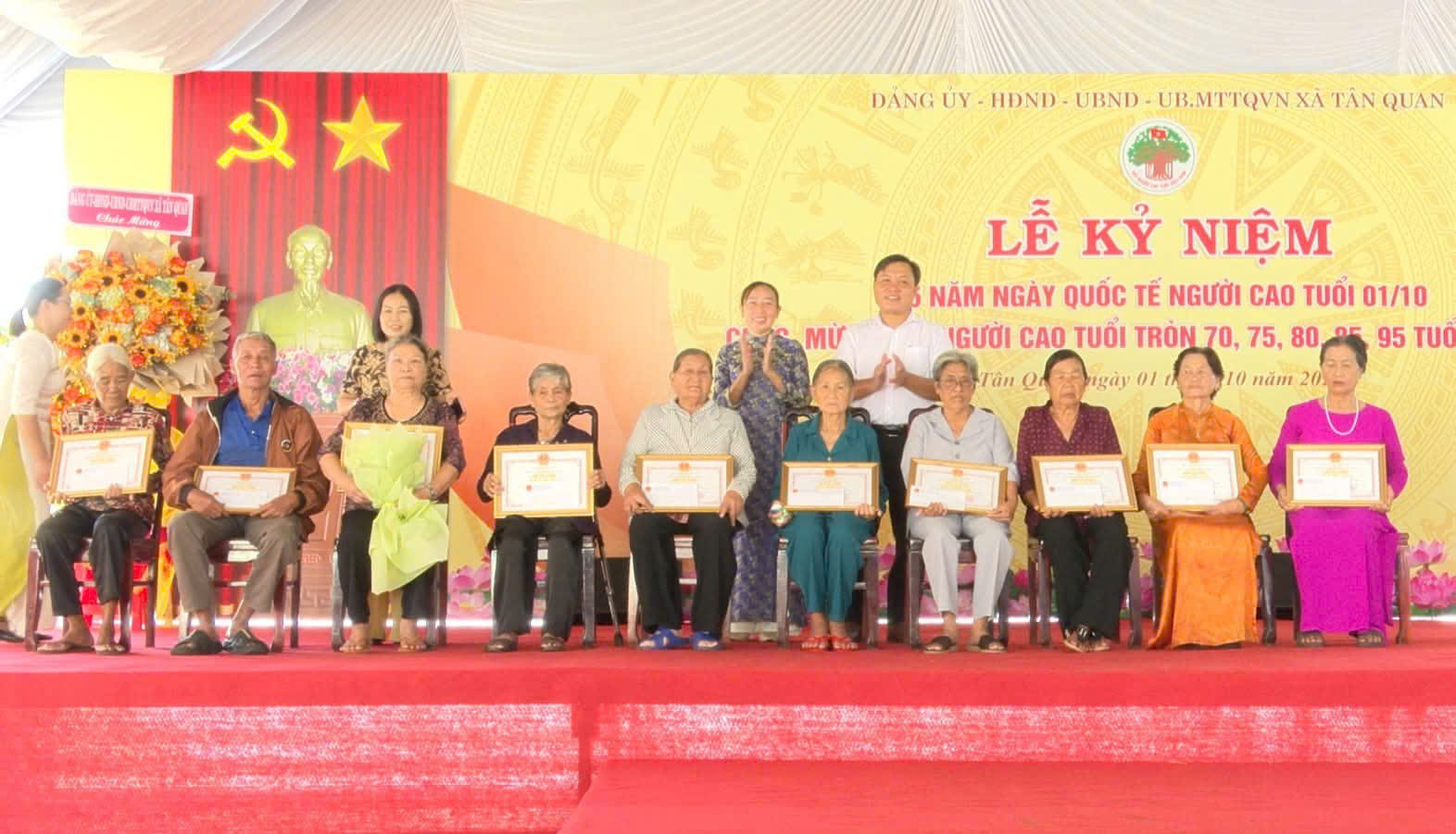 Sáng ngày 01/10/2025, trong không khí đầm ấm, nghĩa tình, Đảng uỷ - Hội đồng nhân dân - Ủy ban nhân dân - Ủy ban Mặt trận Tổ quốc Việt Nam xã Tân Quan long trọng tổ chức Lễ kỷ niệm 35 năm Quốc tế Người cao tuổi 01/10 và chúc thọ, mừng thọ người cao tuổi tròn 70, 75, 80, 85, 95 tuổi trên địa bàn xã Tân Quan (đối với xã Tân Quan cũ và xã Quang Minh cũ đã tổ chức chúc thọ trước khi thực hiện chính quyền 2 cấp).
