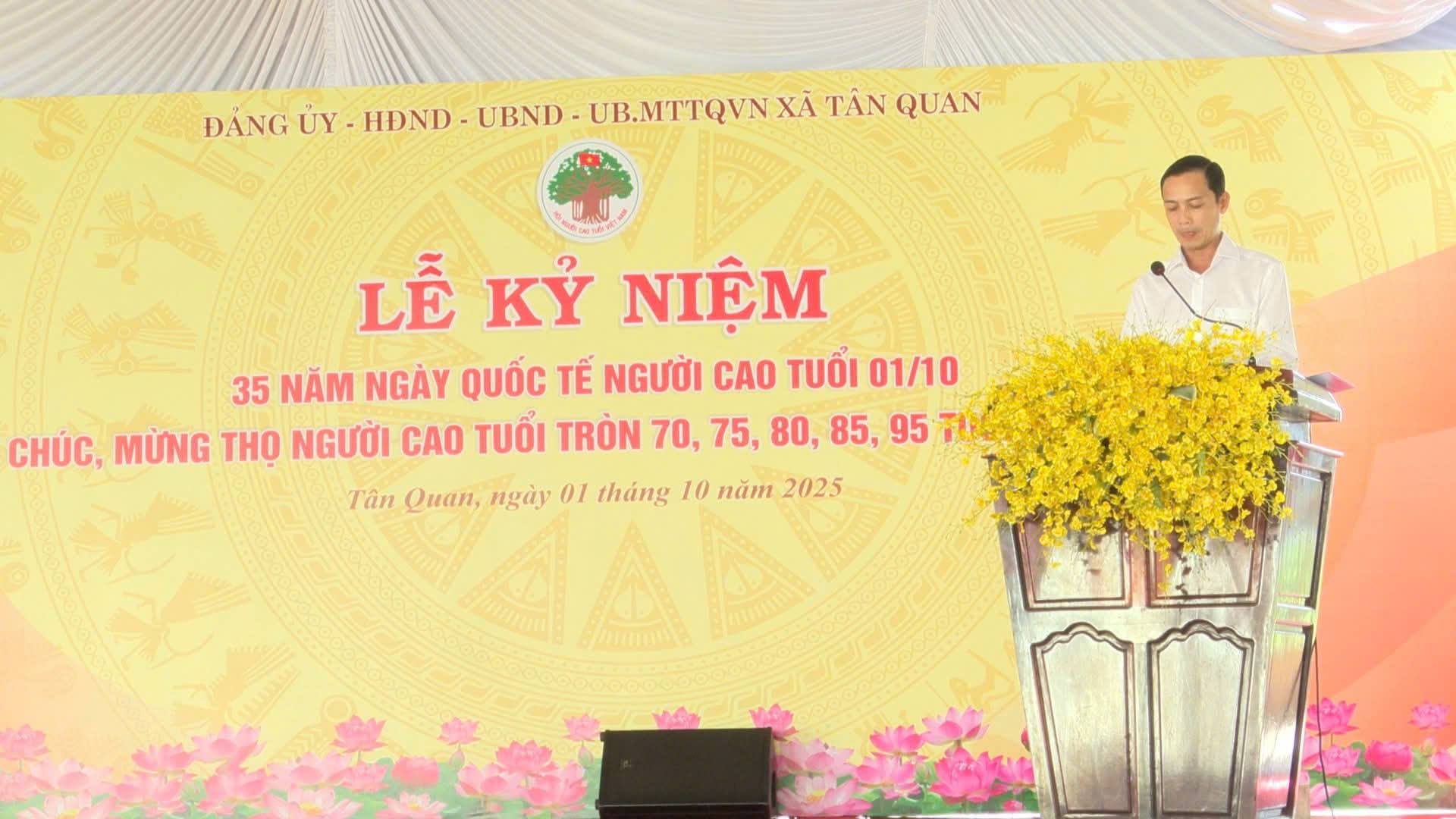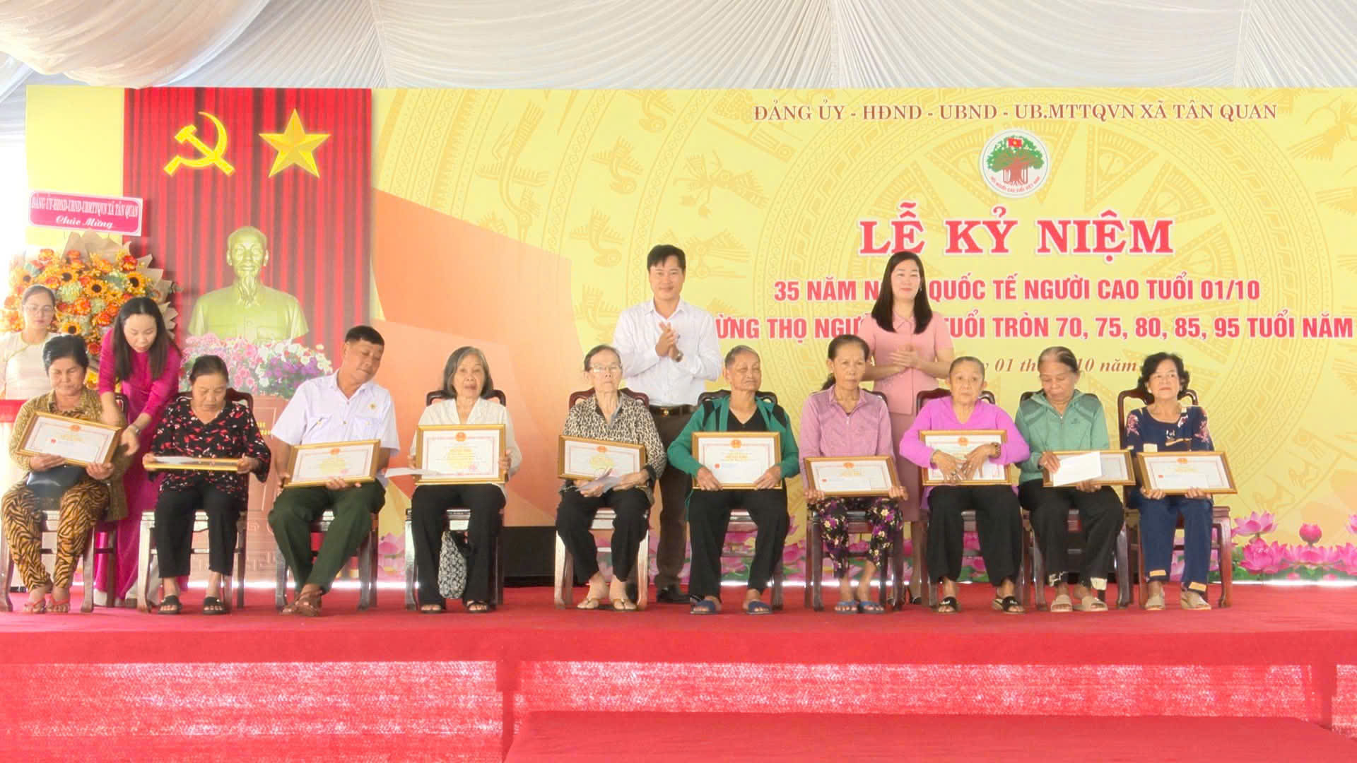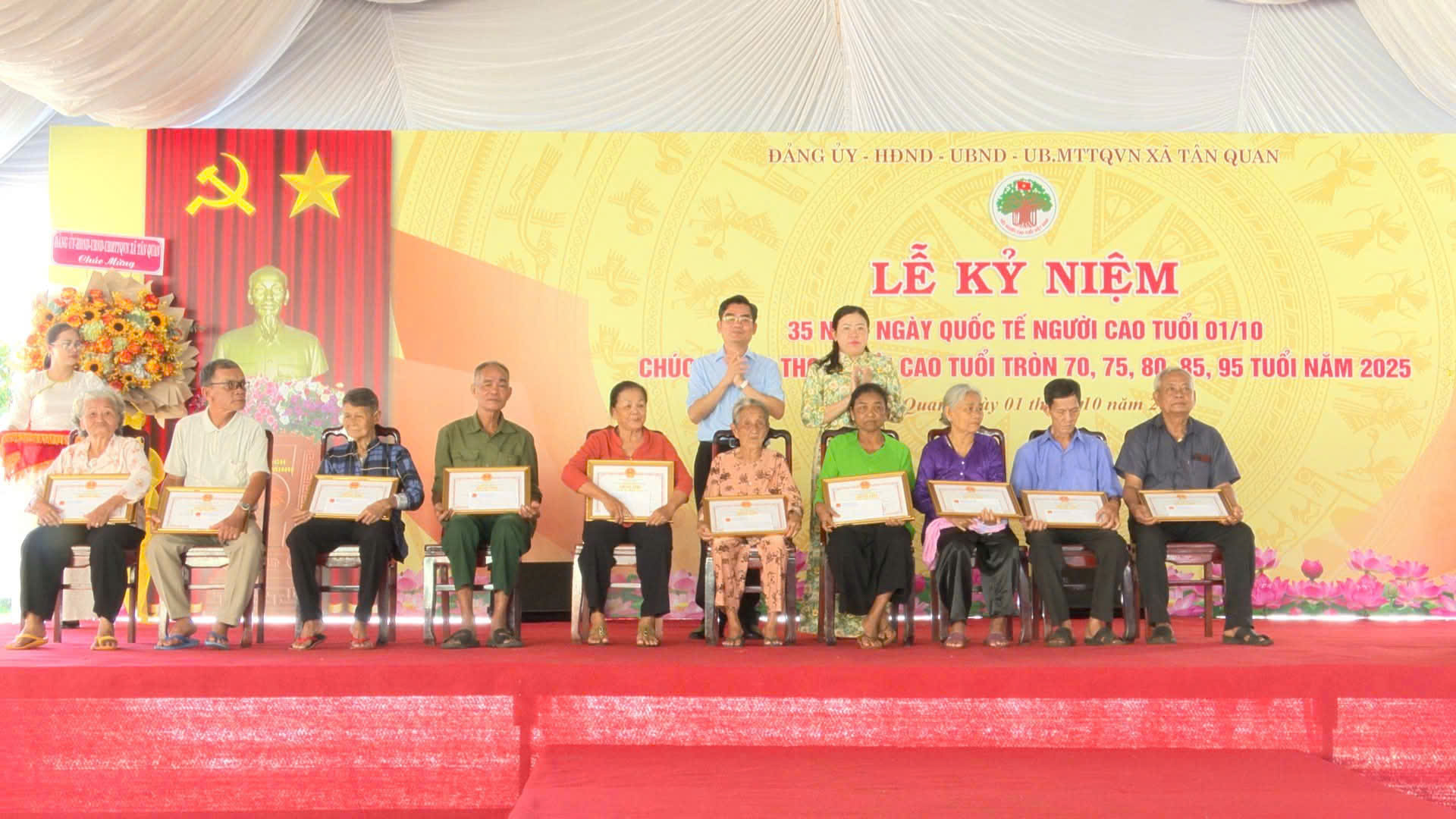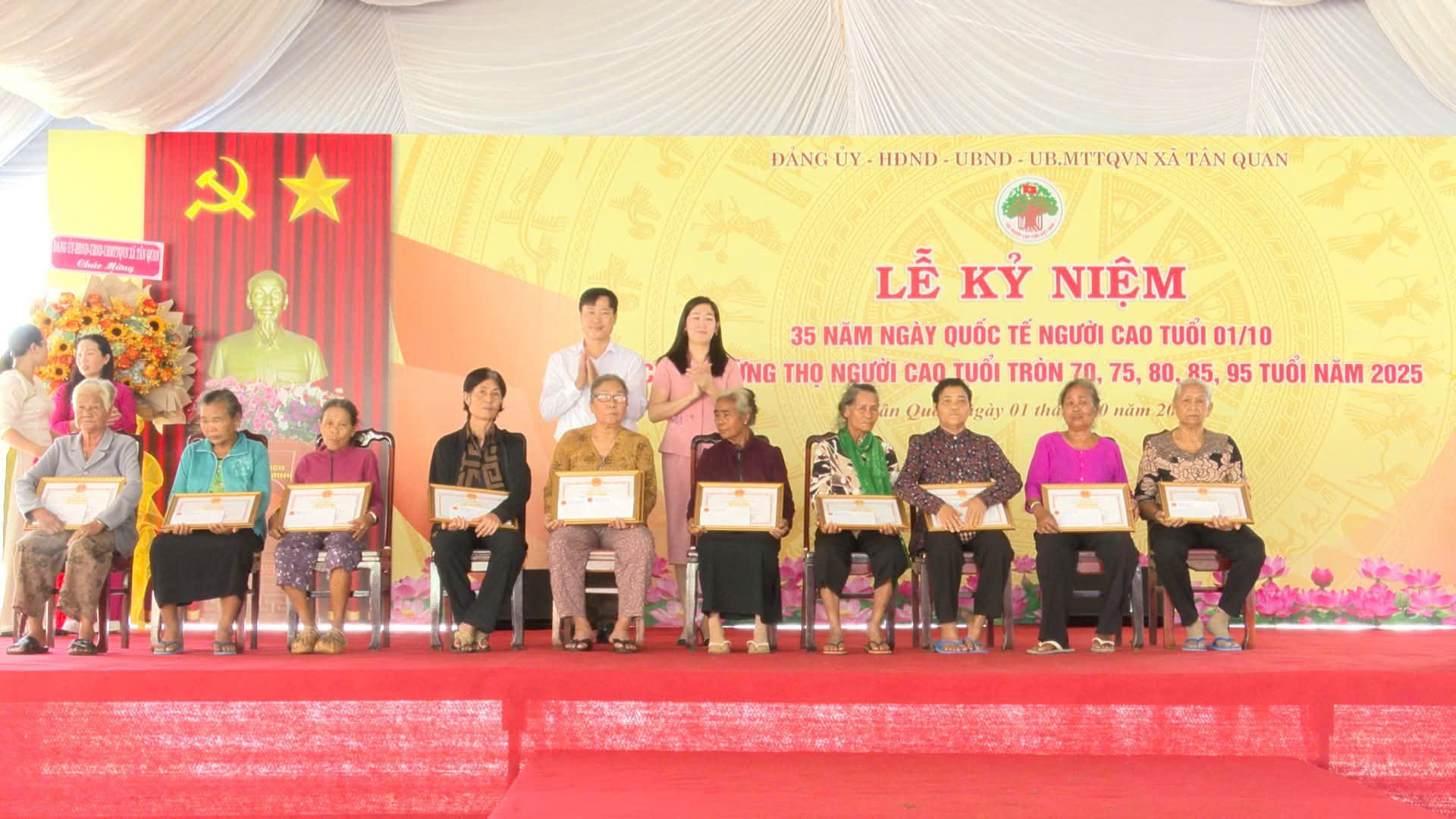 Sáng ngày 01/10/2025, trong không khí đầm ấm, nghĩa tình, Đảng uỷ - Hội đồng nhân dân - Ủy ban nhân dân - Ủy ban Mặt trận Tổ quốc Việt Nam xã Tân Quan long trọng tổ chức Lễ kỷ niệm 35 năm Quốc tế Người cao tuổi 01/10 và chúc thọ, mừng thọ người cao tuổi tròn 70, 75, 80, 85, 95 tuổi trên địa bàn xã Tân Quan (đối với xã Tân Quan cũ và xã Quang Minh cũ đã tổ chức chúc thọ trước khi thực hiện chính quyền 2 cấp).